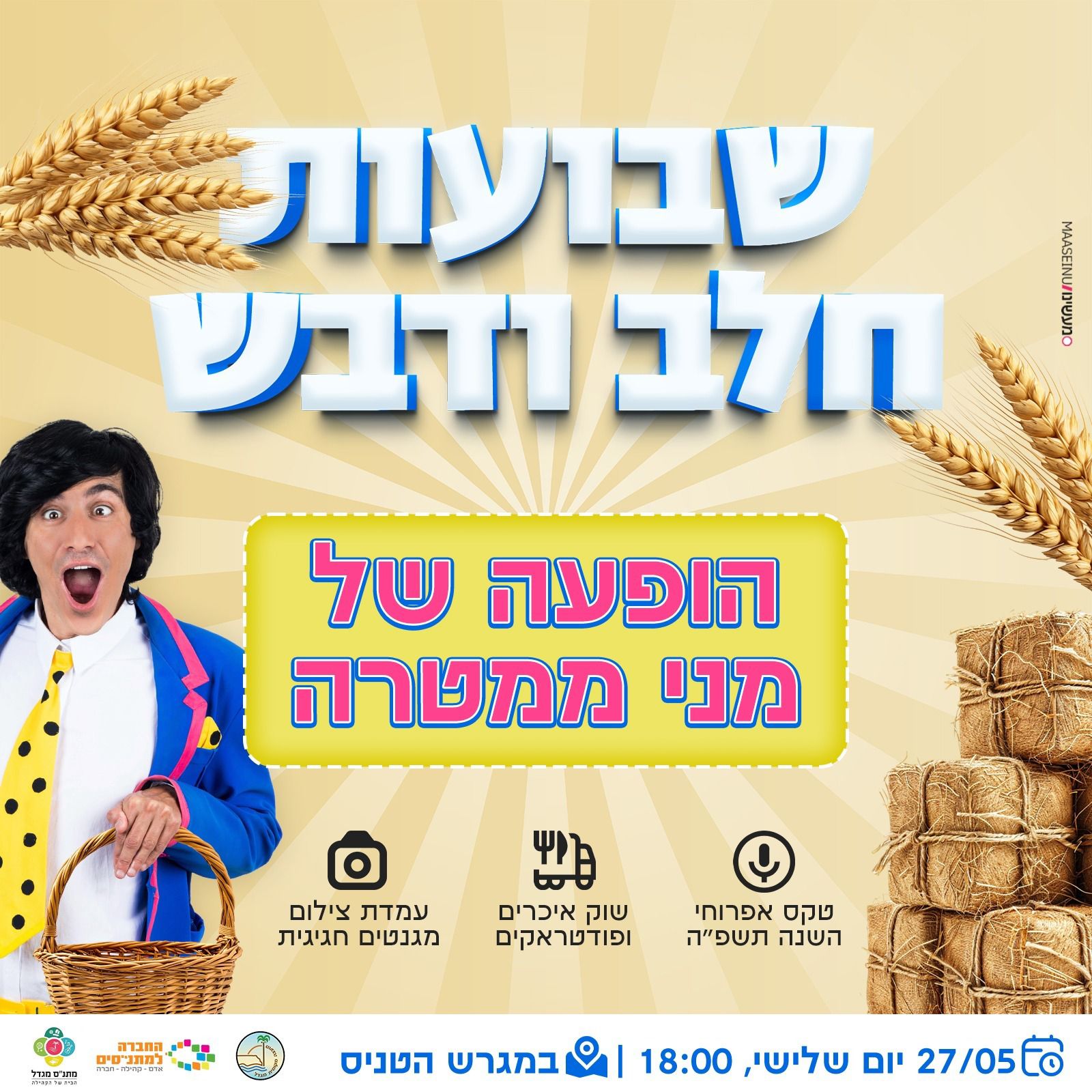 הנכם מוזמנים לחגוג יחד כל הקהילה חגיגת שבועות מיוחדת במינה עם שוק איכרים ותוצרת מקומית, דוכני מזון, טקס אפרוחי השנה תשפ״ה, עמדת צילום מגנטים מגניבה ו- הופעה מרכזית של כוכב הילדים — מני ממטרה!
